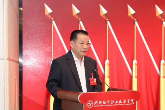 校党委副书记、校长邵庆祥在大会上作了题为《守正创新 勇毅前行 奋力争创高水平职业技术大学》的学校工作报告。他回顾了2022年以来,学校在专业建设、教学质量、技能培养、人才培养、产教融合、师资队伍、双高建设、社会服务、社会治理、对外交流、民生保障、办学空间等方面取得的成绩,指出2023年是双高建设收官之年、筹建职教本科教育启动之年和“十四五”规划攻坚之年,学校将深入实施“质量立校、特色兴校、依法治校、人才强校”四大战略,强化职业教育类型特征,以双高建设、嵊州校区建设为主线,深化内涵建设,注重“提质培优”,实施好名校、名师、名课程、名教材、名校友、名专业、名项目、名成果8“名”工程,建设好清廉、美丽、幸福经院,着力推进“一体(品牌经院建设)两翼(双高建设和职教本科建设)一基(数字经院建设)”取得新突破,为浙江“两个先行”做出经院贡献。