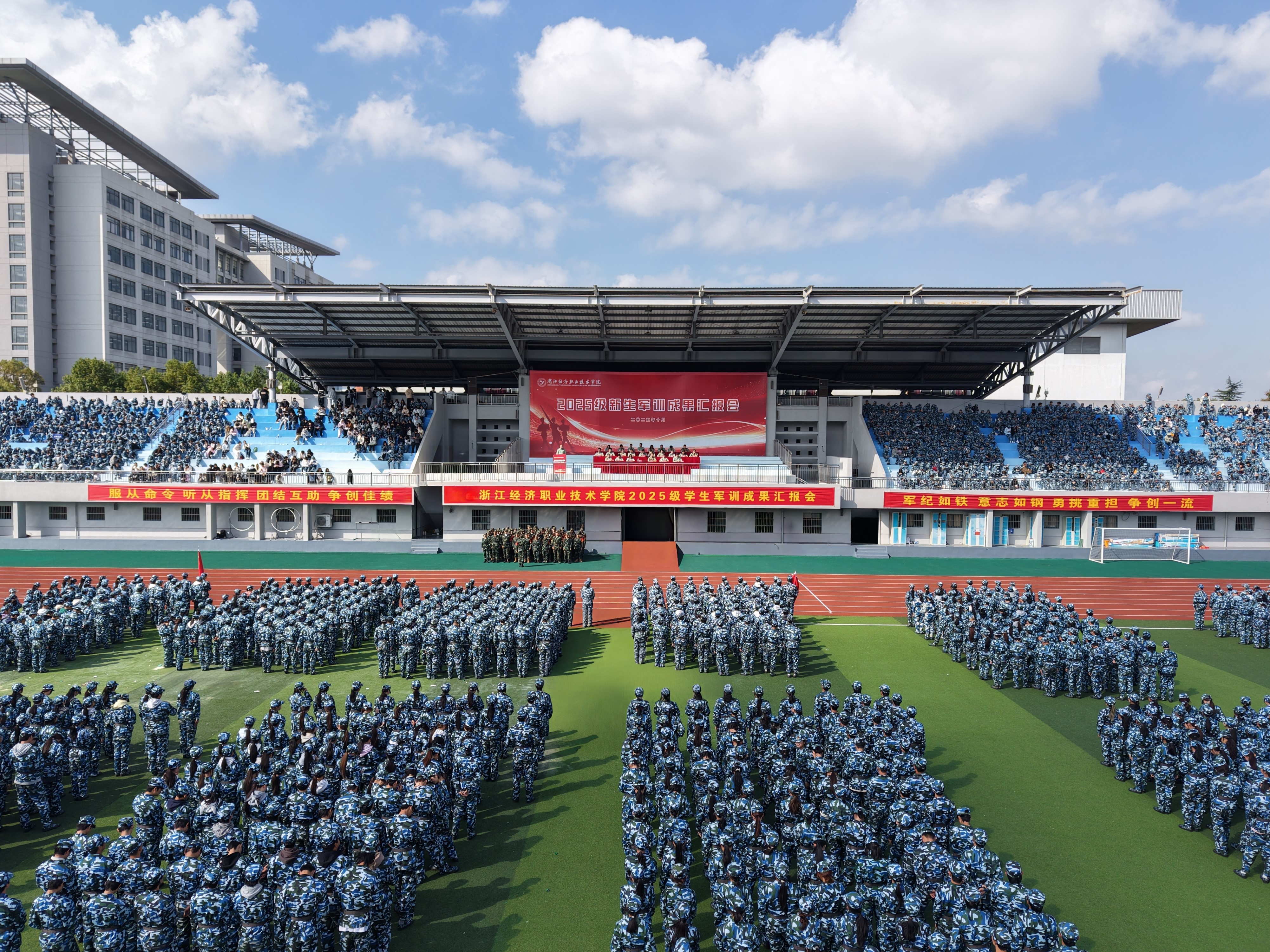 迷彩淬炼致青春 飒爽英姿阅新篇 我校举行2025级学生军训成果汇报会 10月24日上午,我校2025级学生军训成果汇报会在田径场隆重举行。学校党委副书记、工会主席吕红刚及党委班子成员、钱塘区人武部上校部长张于林出席大会。各二级学院领导班子、相关职能部门负责人、辅导员、新生班主任、军训教官及2025级全体参训新生参加大会。吕红刚作军训总结讲话。他代表学校向顺利完成军训的全体新生表示...