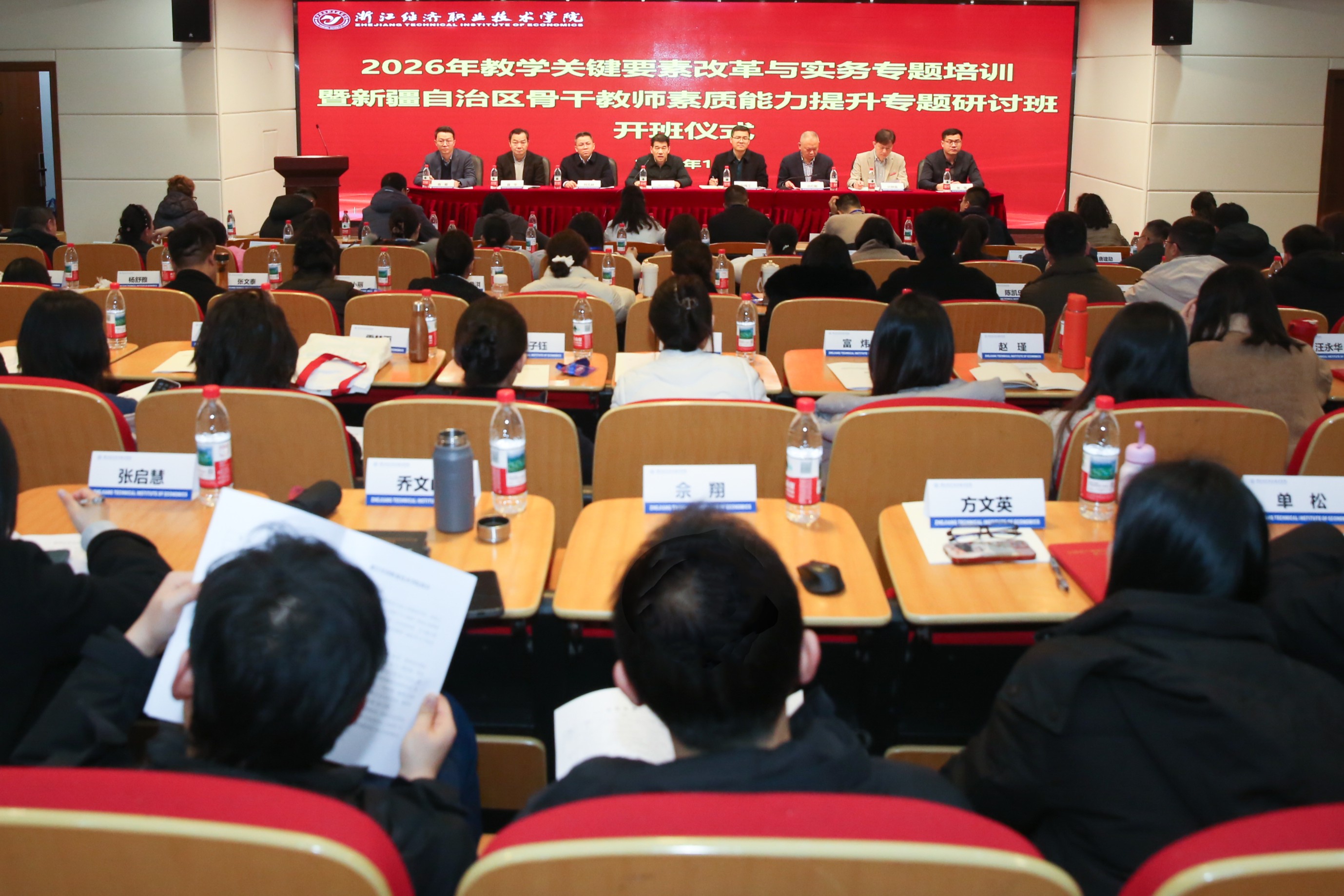 1月19日,2026年教学关键要素改革与实务专题培训暨新疆维吾尔自治区骨干教师素质能力提升专题研讨班在学校顺利开班。浙江省教育厅职业教育与成人教育处处长陈达,学校党委书记叶伟江,校长、党委副书记柯孔林,党委委员、副校长聂华,党委委员、组织部(人才办)部长(主任)叶林良,阿克苏职业技术学院副院长陈卿(援疆),阿克苏工业职业技术学院副院长张穹(援疆)等出席开班仪式,学校党委副书记、工会主席吕红刚主持开班仪式。来自阿克苏职业技术学院、阿克苏工业职业技术学院、乌鲁木齐职业大学及学校各二级学院的100余位教学骨干齐聚一堂,共同开启这场跨越东西的职教赋能之旅。
